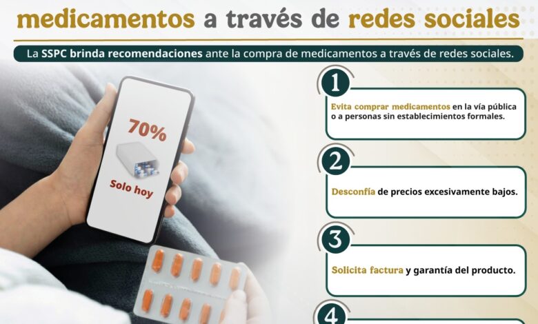 La Secretaría de Seguridad y Protección Ciudadana advierte sobre los riesgos de comprar medicamentos en redes sociales. Estos medicamentos pueden ser falsos, caducados o alterados, lo que puede causar efectos graves en la salud. También se ha visto que algunos de estos medicamentos son robados, falsificados o provienen de lugares no autorizados. Por eso, es importante seguir estas recomendaciones: Evita comprar medicamentos en redes sociales o lugares no autorizados, ya que no se puede garantizar su seguridad. No compres medicamentos controlados sin receta, ya que pueden ser ilegales. Solo haz compras en sitios autorizados y establecidos. Desconfía de precios muy bajos, ya que podrían ser productos irregulares. Pide siempre factura y garantía del producto. Verifica el número de lote y registro sanitario antes de comprar. Ten cuidado con ofertas de productos escasos, ya que pueden ser fraudulentas. Si necesitas ayuda para denunciar, llama a la Unidad de Policía Cibernética de tu estado. Puedes encontrar su número en la Ciberguía. Estas medidas buscan proteger a la ciudadanía de posibles fraudes y riesgos para la salud al comprar medicamentos por internet.
