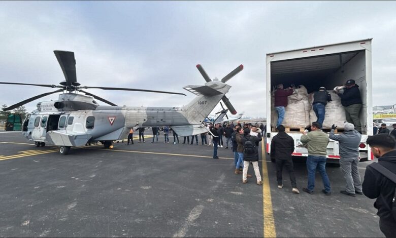 Hoy salieron varios helicópteros desde Pachuca llevando comida y ayuda a las zonas afectadas por las lluvias. Los secretarios Guillermo Olivares Reyna y Salvador Cruz Neri están liderando esta acción en Huehuetla, uno de los lugares más golpeados. En un helicóptero se envían 560 paquetes de alimentos, y en otro se trasladan 300 despensas a Tianguistengo. Además, un avión de la Marina Armada aterrizó en el aeropuerto local para entregar material de apoyo. Todo esto siguiendo las instrucciones de la presidenta Claudia Sheinbaum Pardo para ayudar al pueblo de Hidalgo.