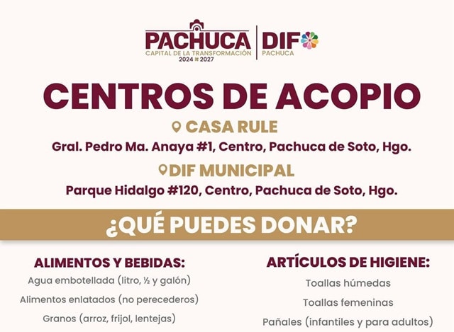 El Gobierno Municipal de Pachuca está pidiendo a la gente que done alimentos, artículos de limpieza y cosas importantes para ayudar a las familias afectadas por las lluvias en varios municipios del estado. Gracias a la colaboración de la gente de Pachuca, se han recolectado muchos víveres que se han dado al DIF Hidalgo, quienes se encargan de distribuirlos en los lugares más afectados. La ayuda de la gente es muy importante para juntar alimentos, productos de higiene y cosas necesarias que serán enviados a las comunidades que están sufriendo por las lluvias. Puedes llevar tus donaciones a Casa Rule o al DIF Pachuca en los horarios especificados. Cada ayuda, no importa si es pequeña, hace una gran diferencia para aquellos que más lo necesitan.