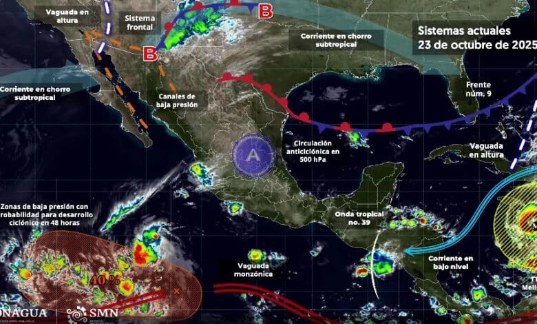 Para hoy se esperan lluvias fuertes en varias partes de México debido a diferentes condiciones climáticas. En el oriente y sureste del país, así como en Chiapas, habrá chubascos y lluvias fuertes. En la península de Yucatán se esperan también lluvias fuertes por la influencia de la humedad del mar Caribe. En el noroeste y norte, habrá viento, lluvias y chubascos, con rachas de viento y descargas eléctricas, principalmente en Chihuahua. Además, se pronostican lluvias aisladas en el norte, occidente y centro de México, destacando fuertes lluvias en Michoacán. Por otro lado, se prevé baja probabilidad de lluvia en la Mesa del Norte, Mesa Central y noreste del país debido a un anticiclón. Las lluvias también pueden estar acompañadas de descargas eléctricas y granizo. Se recomienda estar atentos a posibles deslaves, inundaciones y la caída de árboles por las condiciones climáticas. Además, se esperan temperaturas máximas entre 30 y 40°C en varias regiones del país.