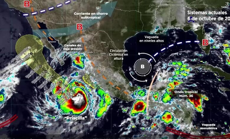 Hoy el huracán Priscila provocará lluvias intensas en algunos estados del país y fuertes vientos en las costas del Pacífico central mexicano. Además, la onda tropical núm. 36 ocasionará lluvias intensas en el sureste, mientras un canal de baja presión generará más lluvias en diversas zonas del país. Se esperan también descargas eléctricas y posible caída de granizo en algunas regiones. En el océano Pacífico, los ciclones tropicales Octave y Priscila pueden traer condiciones adversas, así que es importante seguir las recomendaciones del Servicio Meteorológico Nacional. Las lluvias pueden afectar la visibilidad, aumentar los niveles de ríos y arroyos, y provocar deslaves e inundaciones. Las fuertes ráfagas de viento podrían derribar árboles y anuncios. En cuanto a las temperaturas, se espera calor intenso en varios estados y valores mínimos en algunas zonas altas. También se pronostican vientos intensos y oleaje elevado en varias partes del país. Hay que estar atentos a las indicaciones de Protección Civil y mantenerse informados sobre la evolución de la situación.