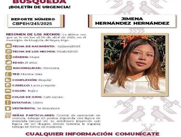 Una joven de 22 años, reportada como desaparecida desde abril en Huejutla, fue encontrada muerta en una fosa clandestina en Tepetzintla, Veracruz. La Fiscalía de Veracruz confirmó que se trataba de Jimena Hernández Hernández, de Yahualica, Hidalgo. Sus restos fueron hallados el 18 de agosto y su identificación se confirmó recientemente. El cuerpo ya fue entregado a su familia.